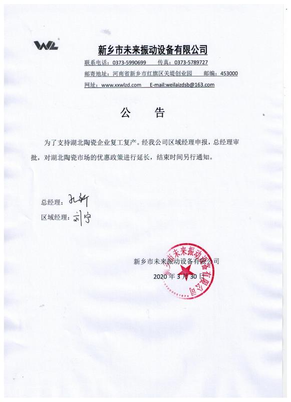 **先感謝各位客戶多年支持與厚愛,深表謝意!此次疫情來勢兇猛,牽動著每個國人的心,未來振動為表達對新冠肺炎疫情防控工作的支持,盡一份綿薄之力,共盼春來!針對(湖北地區)陶瓷市場客戶于2020年3月30日繼續享受,我司制定的開發方案“客戶體驗活動”我們祈愿春暖花開,疫情早日結束,在此,向所有防控一線的醫務、防疫工作者致敬!中國加油!